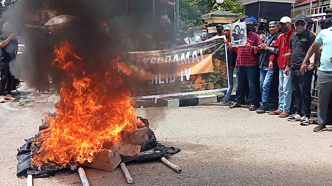 “Hari ini di depan Polda NTT kami bawa dua keranda, satu untuk Astri dan satu untuk Lael sebagai tanda hilangnya keadilan di bumi tinggi toleransi,” kata koordinator umum massa aksi, Kristo Kolimon sebelum keranda dibakar.