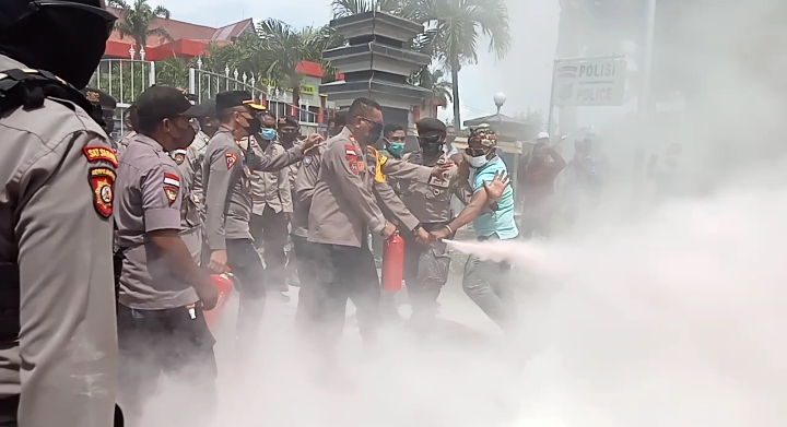 Asap hitam mengepul di depan gerbang Polda NTT sekitar pukul 13.00 WITA. Upaya aparat memadamkan api dihadang oleh massa aksi.