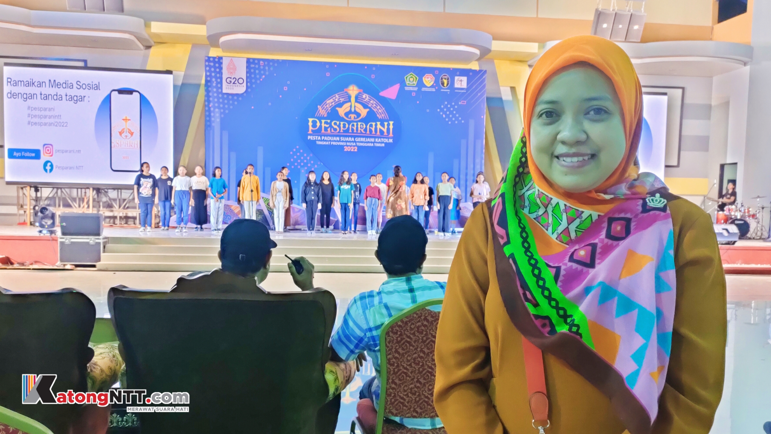 Perempuan berjilbab, Ima Usman, berdiri di samping panggung dan mengamati para penari dari Sanggar Lopo Gaharu saat malam gladi resik Pesparani NTT.