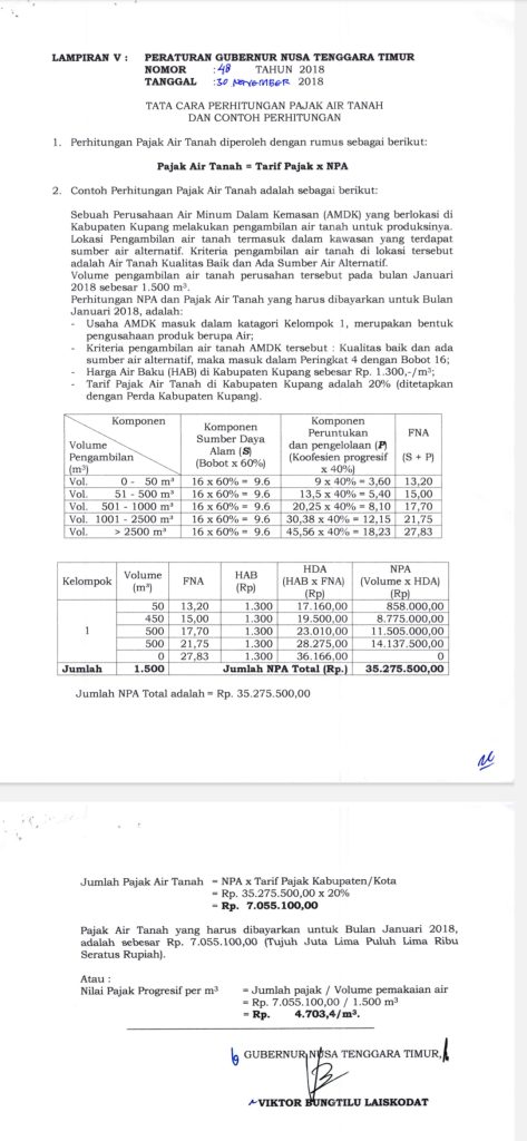 Aturan soal pajak ini termaktub dalam Peraturan Daerah (Perda) Provinsi NTT Nomor 11 Tahun 2018 Tentang Pengelolaan Air Tanah dan Pergub NTT Nomor 48 Tahun 2018 Tentang Nilai Perolehan Air Tanah.