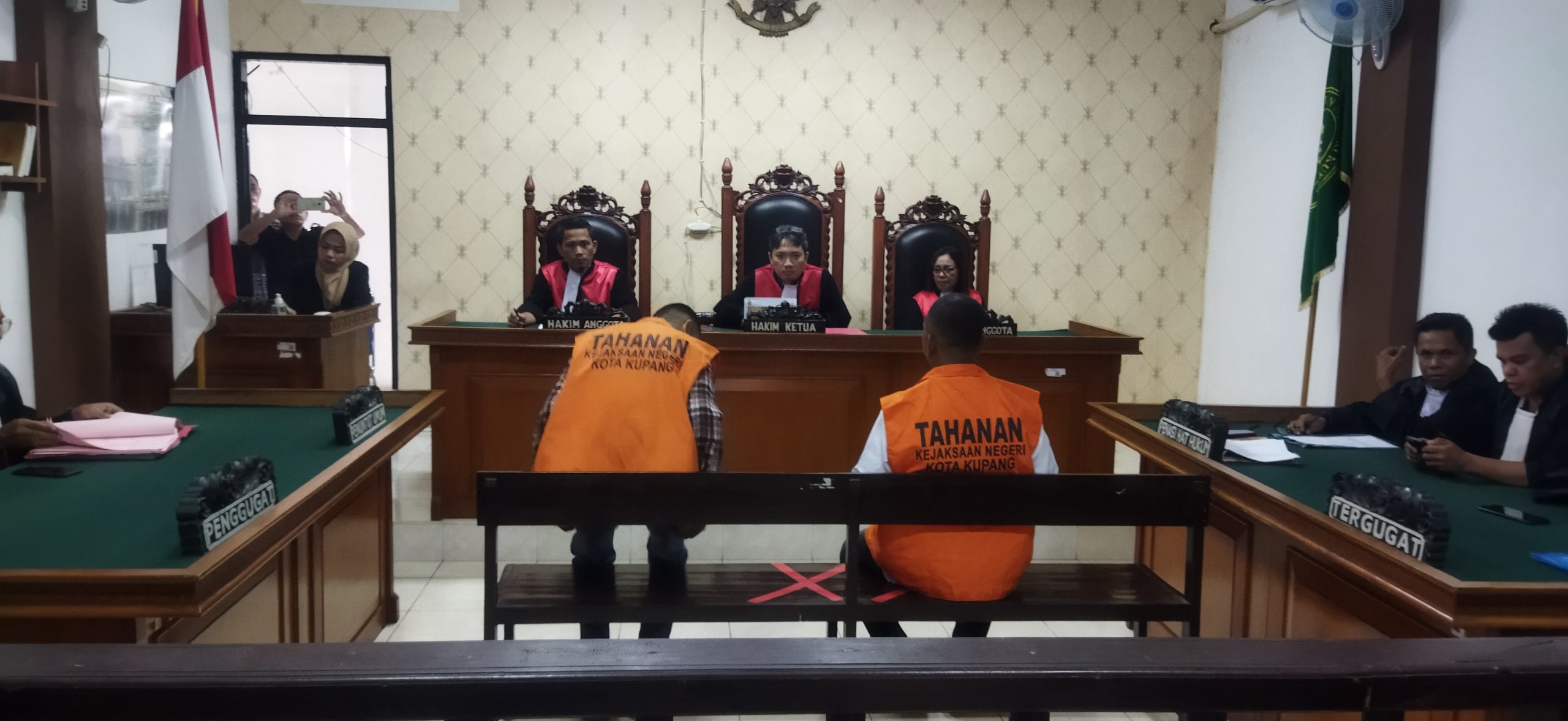 Dua terdakwa memasuki ruang persidangan di Pengadilan Negeri Kota Kupang, jam 11 siang. Keduanya mengenakan rompi tahanan Kejaksaan Negeri Kota Kupang berwarna oranye.